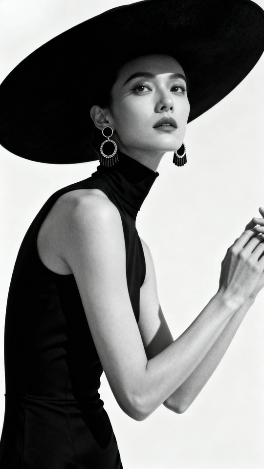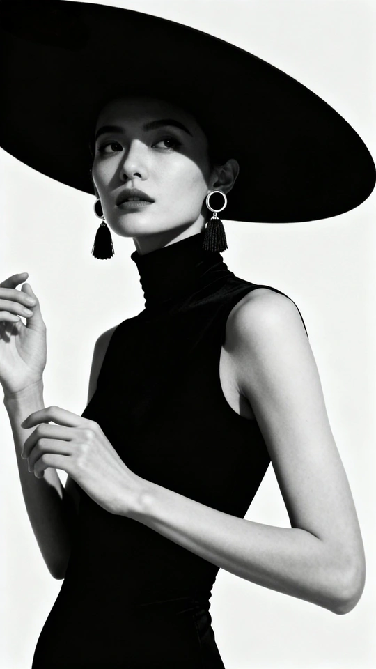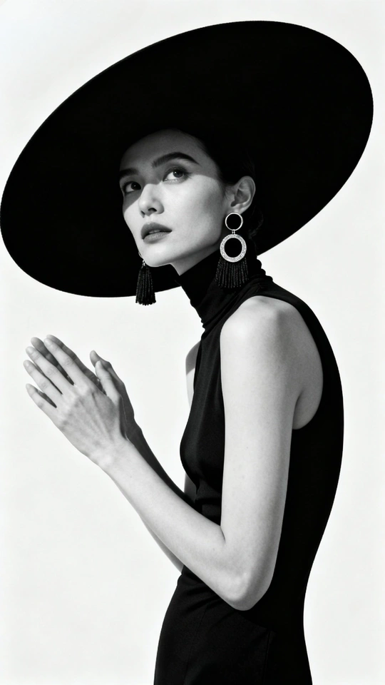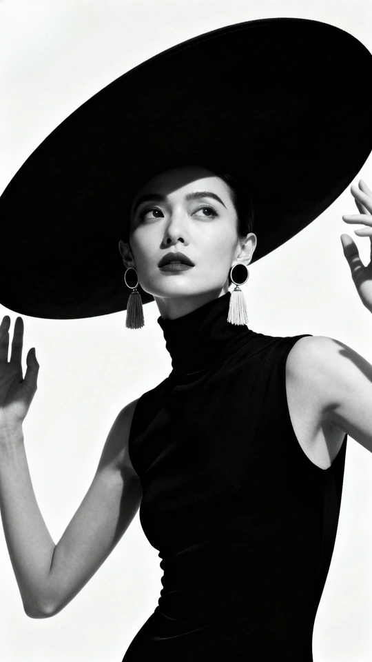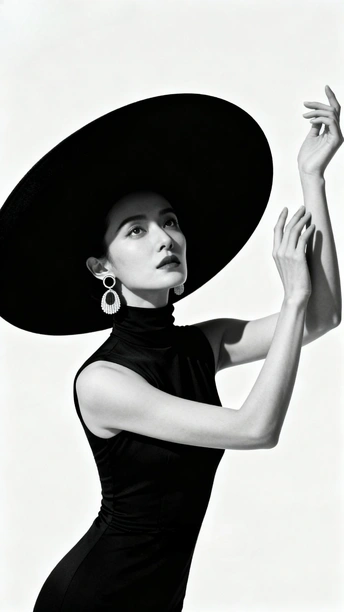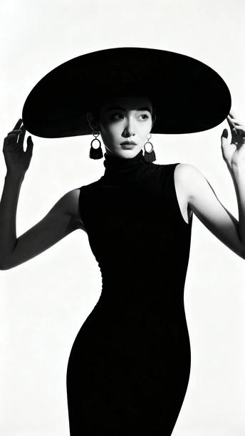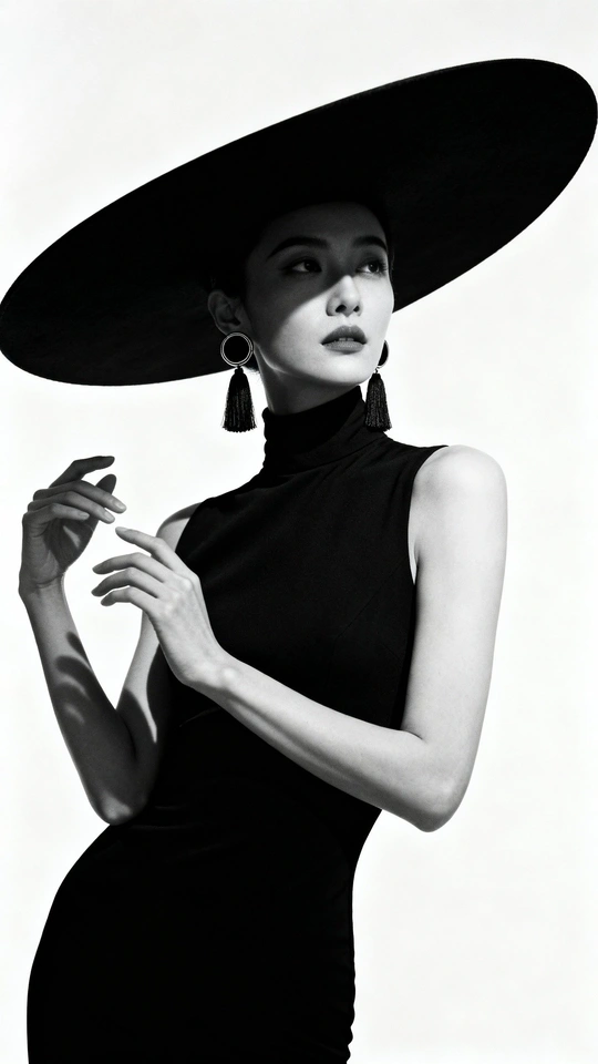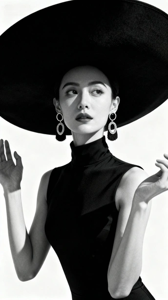 她把自己 裁成一枚黑色的惊叹号 顶在头上的帽檐 撑满整个留白的苍穹 流苏耳环在耳畔轻颤 是墨色的蝶 掠过颈间高领的暗涌 双手似欲语的蝶翼 在光影里织着无声的梦 黑白是她的母语 在极简的疆域里 时尚与艺术热烈拥吻 每一道轮廓都是诗的韵脚 在时间的稿纸上 永远鲜活