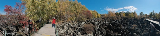 在五大连池的熔岩台地上,秋日将树木晕染成斑斓的画布,黑褐色的火山岩沉默如岁月的印章。木栈道蜿蜒其间,行人以镜头捕捉这火山与秋意的交响,蓝天为幕,每一处色彩都是自然写给北国的诗。