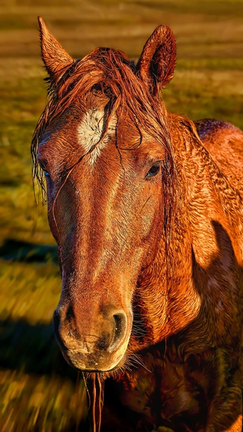 暖调鎏金的光影,为马身镀上一层复古油画质感,湿润的鬃毛与肌肤折射出生命的张力,仿佛刚从溪流中奔出,带着旷野的野性与自由。 背景朦胧的草甸在暖光里晕染成温柔的底色,将马的桀骜与诗意糅合,营造出“天地为幕,生灵为诗”的史诗感,每一都在诉说自然的壮美与生命的鲜活。