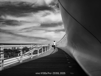 这张黑白摄影作品展现了优秀的视觉叙事能力。光影的运用非常出色,桥面的明暗对比增强了画面的纵深感和空间感。构图上,桥的弧线引导观者的视线,将注意力集中在行走的人身上,增强了画面的故事性。黑白的处理简洁而有力,突出了画面的线条和形状,营造出一种平静而略带孤独的氛围。整体而言,作品在技术和艺术表达上都表现出一定的水准,是一张值得欣赏的作品。建议在后期处理中可以尝试调整对比度,进一步突出光影效果,增强视觉冲击力。