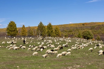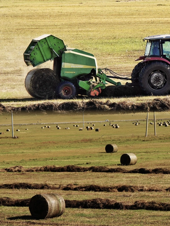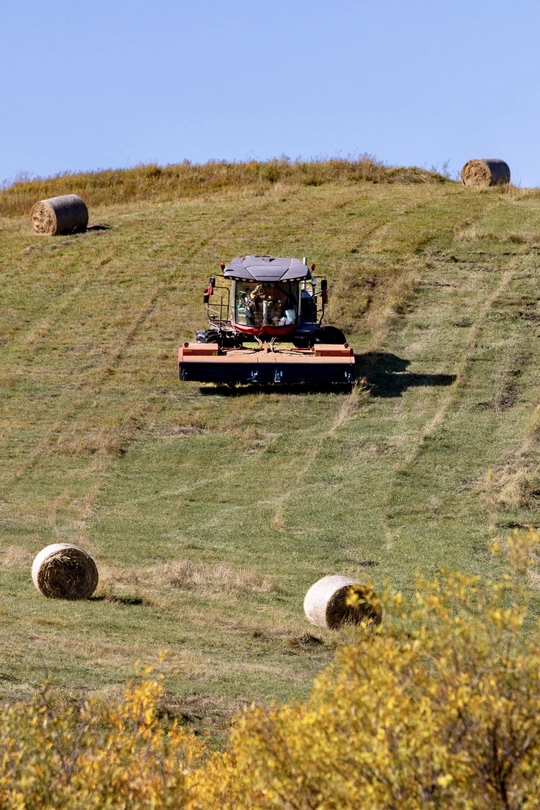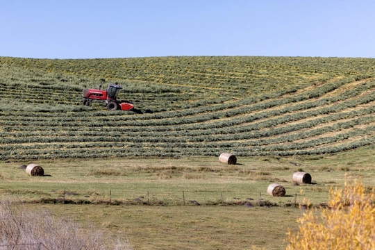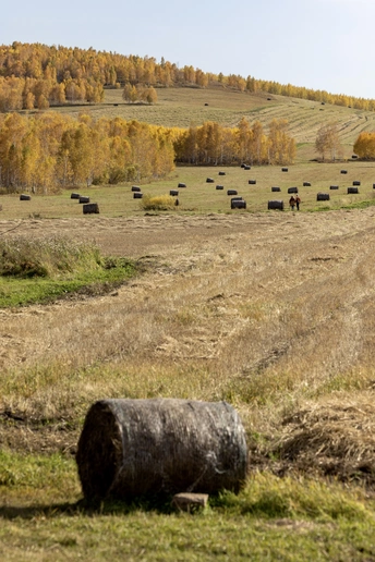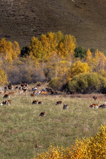 秋意铺满草原,牛群、羊群在黄绿相间的草甸上悠然觅食。农机在坡地穿梭,将牧草卷成一个个草垛。这是草原的秋日牧歌,是自然与劳作共绘的丰收画卷。