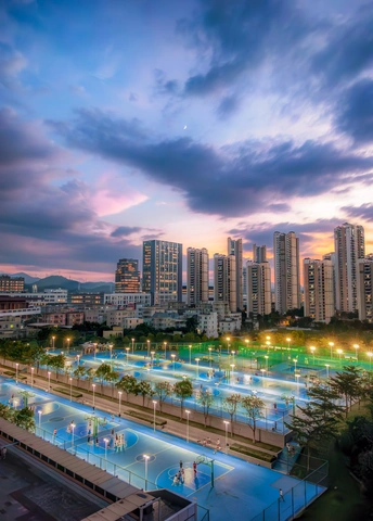 在深圳技术大学的黄昏时分,运动场上的灯光渐次亮起,蓝色地面与奔跑的身影交织成青春的画卷。近处,篮球与排球场地中跃动的身影挥洒着活力,绿树环抱的场地边缘为画面注入盎然生机;远处,校园建筑与城市高楼在绯红暮色中剪出硬朗轮廓,天际线处夕阳将云朵染成金红,一弯新月已悄然悬于穹庐,似与人间灯火悄然呼应。动静之间,既有学术之地的沉静,亦存市井生活的温度,恰是这座城市独有的和谐瞬间