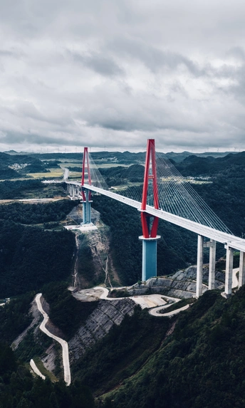在黔地山峦的怀抱里,龙里河大桥如红色巨擘划破天际。红白相间的斜拉索似银练垂空,蓝灰桥塔稳镇深谷,将天堑化作通途。它是工程智慧的结晶,更是山水间的钢铁诗行,在云雾与林海的映衬下,书写着西南大地的跨越与联通,每一寸钢索都脉动着时代的铿锵,每一方桥体都镌刻着筑路者的担当。