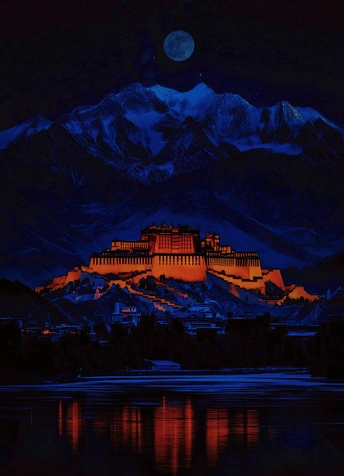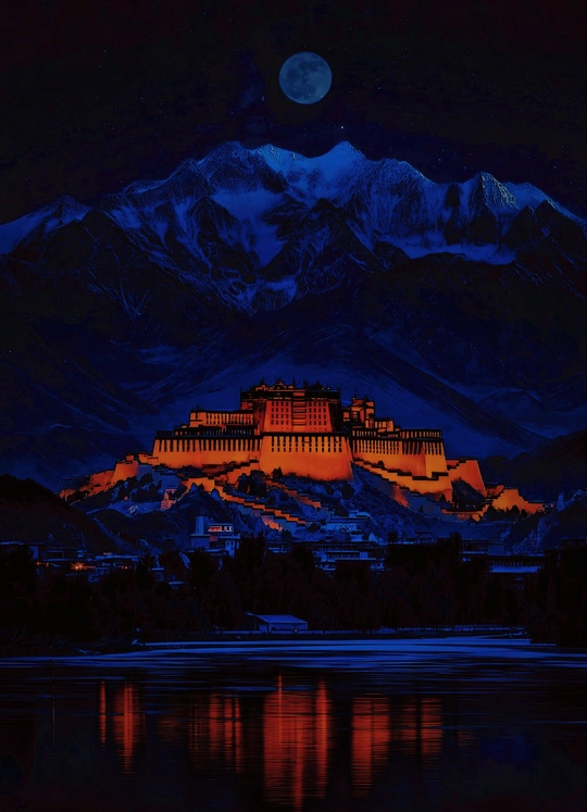 布达拉宫夜色如梦,金碧辉煌在灯光映照下熠熠生辉,巍峨殿宇静立山巅,与夜空星辰相互辉映,庄严而神秘,令人心生敬畏。