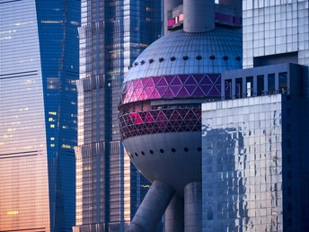 日出蓝调时分站在北外滩眺望黄浦江对岸,东方明珠、金茂大厦、环球金融中心依次排开,在长焦压缩视角下如同庞然巨物一般。建筑的曲线与直线相互交错却无一丝杂乱与多余,充满了秩序感与力量感。日出的晨曦映照在摩天大楼的玻璃幕墙上,展现出从红到蓝色彩渐变的天然明度效果,十分震撼。