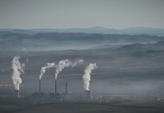 早班飞机,太阳还没出,工厂的烟囱如同炊烟慢慢融入层雾。