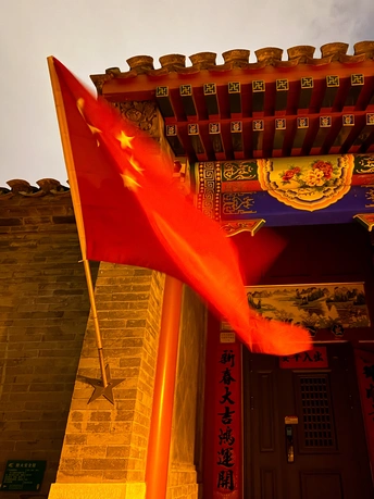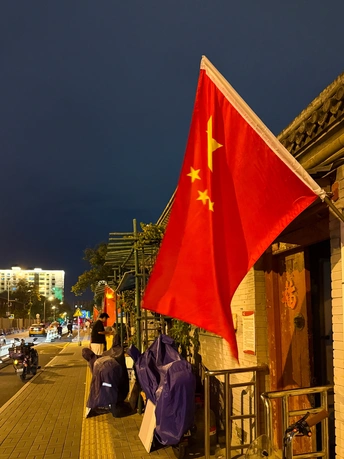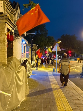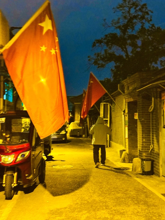 国庆前夜胡同里都挂满了国旗。微风吹来,国旗飘动,感觉很美。