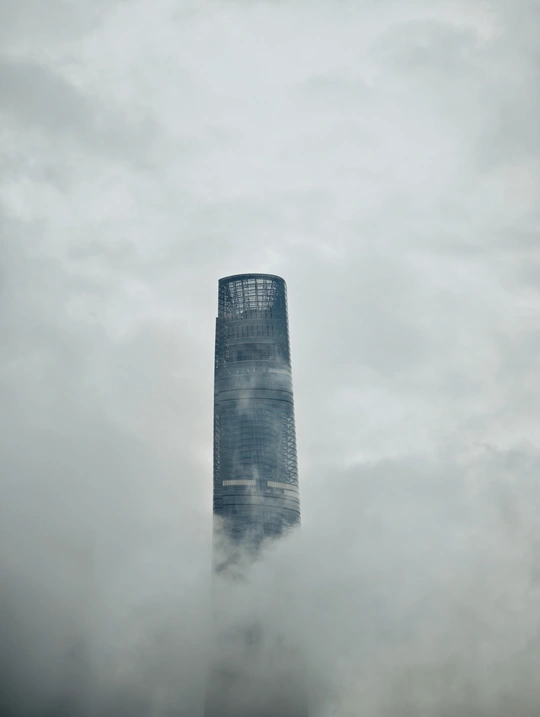 夏日暴雨天,云层很低,上海中心在云中浮现,如空中楼阁一般。