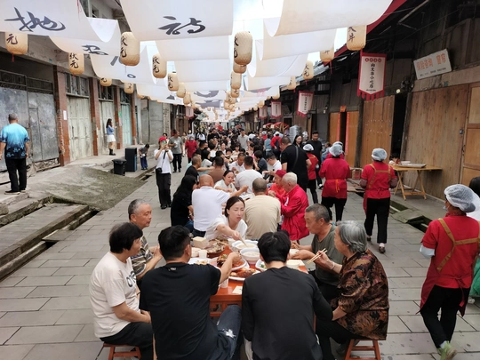 国庆节,邛崃市火井镇的长街宴真热闹。