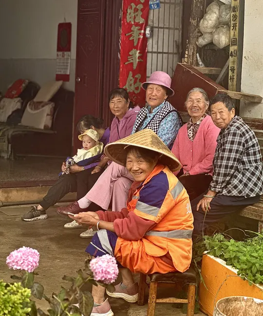 和小伙伴们去山中徙步,路过小村,村口大姐们围着一端,感觉温馨,随拍照! 不想一大姐开口问:“是给我们拍照吗?要把我们拍的美美的!” 随后有了这张照片! 真喜欢这样大大方方的大姐们!