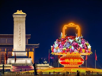 画面中展现的是夜晚的天安门广场,左侧是庄严的人民英雄纪念碑,碑身镌刻着“人民英雄永垂不朽”的金色大字,在灯光映照下熠熠生辉。右侧是一个巨大的花坛装置,造型如一个盛满鲜花的花篮,花篮上方装饰着五彩缤纷的花卉与飞翔的白鸽,象征着和平与繁荣。花篮底部红色底座上写着“欢度国庆 1949-2025”,彰显节日的喜庆氛围。整个画面在夜色中灯火辉煌,色彩绚丽,既庄重又充满生机。