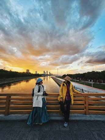桥上晚风轻拂,天际云霞被夕阳燃成金焰。两位摄影爱好者以河畔为幕,将这份秋日落晖与彼此的笑意,定格成旅途中的温柔诗行。