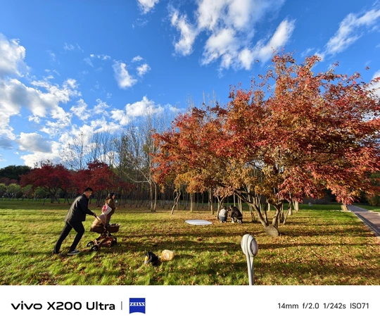 秋日公园,红枫似火,蓝天云絮轻飘。有人推婴车享天伦,有人蹲身捕光影,在这片斑斓里,每一缕风都裹挟着惬意,把日常过成了诗。