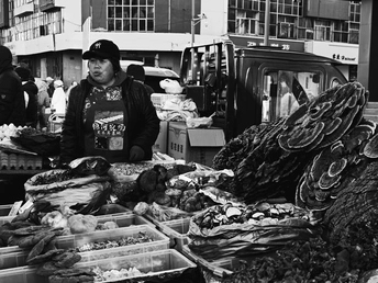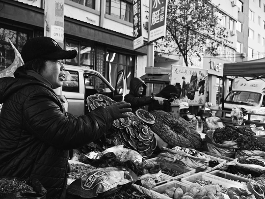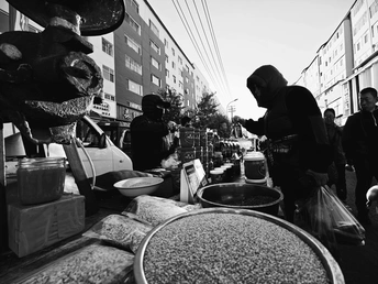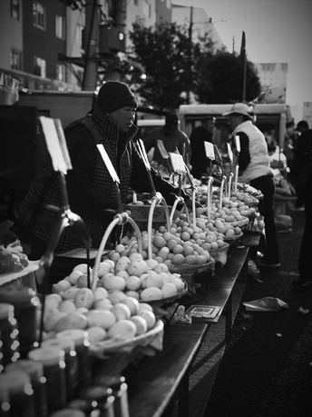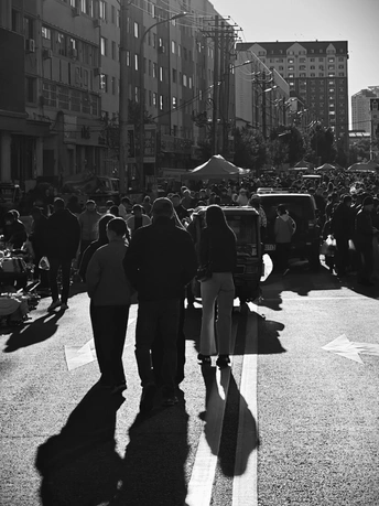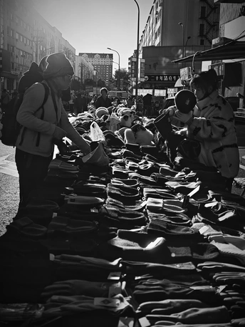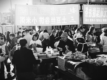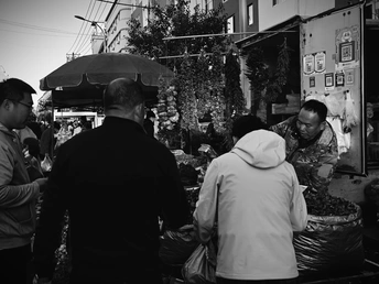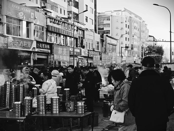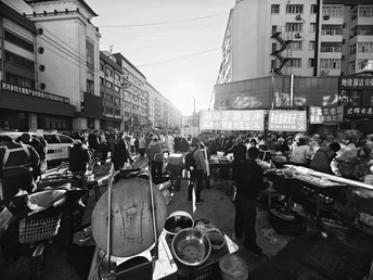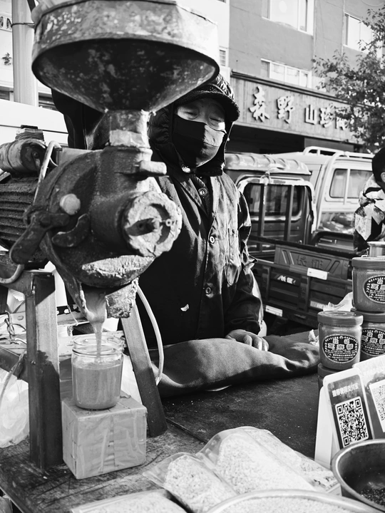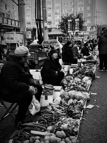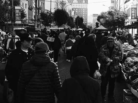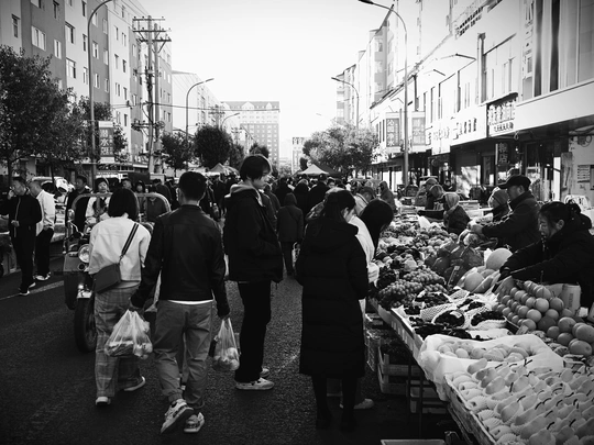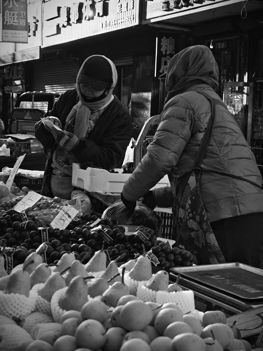 当第一缕晨光落在黑河文化街,早市便成了东北烟火气的盛大舞台。 摊贩们在摊位后忙碌,果蔬干货堆叠出琳琅的小山,鸡蛋在筐篓里码得整整齐齐,粮油干货在器具里散发着质朴的气息;行人在街巷间穿梭,或驻足挑选,或闲聊问价,每一步都踩在生活的鼓点上。 这里没有精致的滤镜,只有黑白镜头下最真实的市井褶皱——是摊主裹紧棉衣守摊的执着,是顾客弯腰挑选时的认真,是交易时一句句带着东北口音的寒暄。每一处细节都是生活热忱的具象,每一次买卖都是人间百态的鲜活切片。 这是黑河清晨最质朴的心跳,是东北大地在日复一日的晨昏里,为平凡生活奏响的动人乐章。