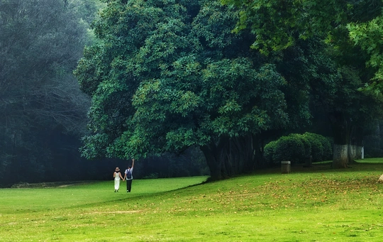 钟山风景区梧桐大道上挤满了人,边上的大草坪却非常空旷,清晨的薄雾让树林更宁静