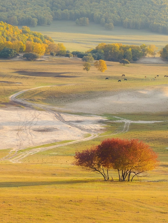 乌兰布统的秋意浓得化不开,金黄草原如绒毯,彩树似火,蜿蜒路与悠然马,把草原秋景酿成了一首动人的田园诗。