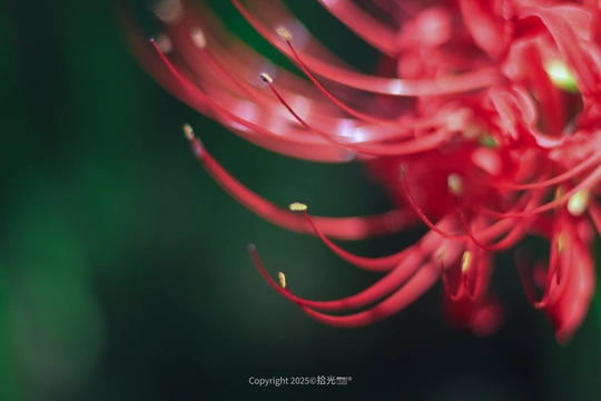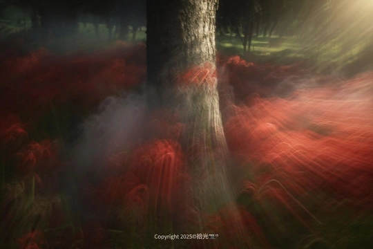 想捕捉彼岸花的瞬间,却在慢门的尝试里撞见了别样的美。那红色的花似在时光里流淌,与老树相依,朦胧又绚烂。风过时,慢门拉长了花的轨迹,像在画一场关于生死彼岸的梦,每一丝光影都是花与时间的私语,拍的时候满心欢喜,原来换种速度看花开,能遇见这么惊艳的浪漫。