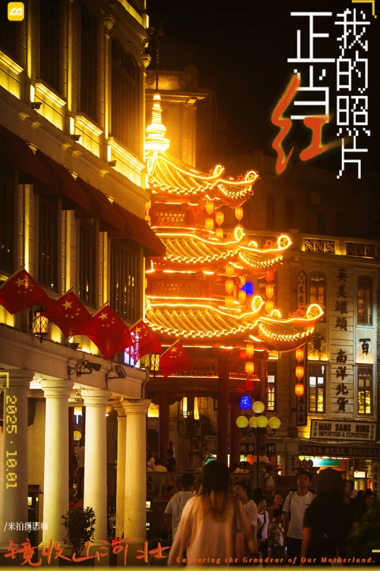 双节期间的汕头小公园,骑楼群被暖黄灯光层层晕染,竹灯笼在街巷间错落悬挂,红绸流苏随晚风轻摆,与五星红旗的鲜亮红意相映成趣,将百年商埠的历史肌理衬得愈发温柔。3D屏幕的光影在骑楼墙面上流转,与竹编灯笼的古朴质感碰撞出奇妙火花,每一处角落都像是精心布置的电影场景,随手定格便是帧帧浪漫的节日大片。