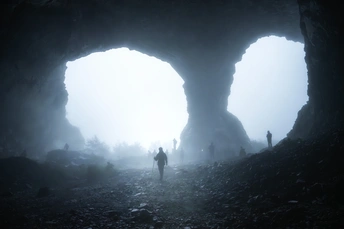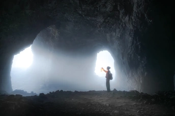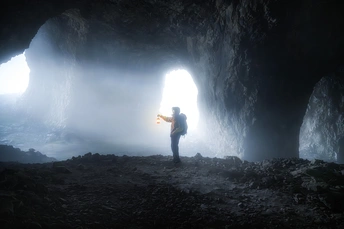 《空谷寻光》的创作核心围绕 “探索与希望” 展开。幽深的洞穴仿佛是未知的困境、迷茫的精神场域,而人物手持灯笼的姿态,与洞穴外透入的明亮天光形成 “双重寻光” 的意象:一方面,灯笼的暖光代表着人类主动向未知探索的勇气与执着;另一方面,洞口的自然光象征着外界的指引、希望的召唤。希望通过黑暗洞穴与明暗光线的强烈对比,传递出人类面对未知时,始终保有对光明的向往与探索欲,让 “寻光” 成为突破困境、追寻精神出口的隐喻,引发观者对 “追寻” 与 “希望” 的共鸣。 拍摄思路 场景与取景:选取具有宏大空间感的天然洞穴,利用洞穴粗糙的岩壁、错落的碎石与巨大的洞口,营造 “空谷” 的幽深、空旷质感,为 “寻光” 主题搭建富有张力的环境基底。 光线营造:结合自然光与人工光双重运用:以洞口透入的自然光为背景光源,利用光线的漫射(如清晨或傍晚的柔和光线)制造朦胧雾化效果,强化洞穴的空间层次与神秘氛围;人物手持的灯笼作为人工点光源,既照亮人物主体,又在黑暗洞穴中形成视觉焦点,通过暖光与洞口冷光的冷暖对比,加深 “寻光” 的情感与视觉冲击力。 构图设计:采用中景构图 + 引导线布局,将人物置于画面中景,既完整展现