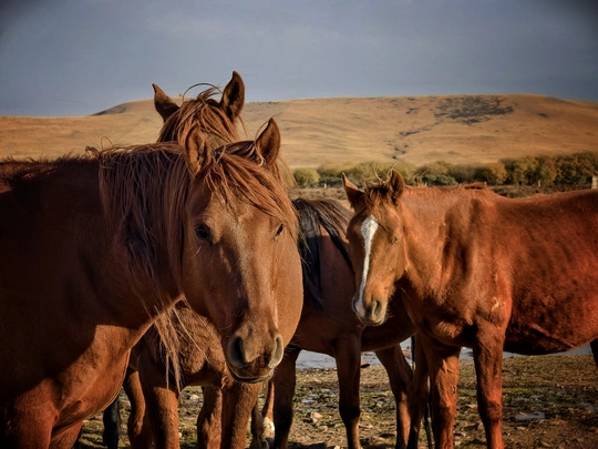 照片拍摄于山丹军马场。几匹棕红色的马在开阔的草原地带驻足。前景的马儿将头转向镜头,黑亮的眼眸与观者形成直接的“对视”,它鬃毛微扬,神态专注而温和。身旁的同伴或露半首,或侧立一旁,一匹带有白色额纹的马也将目光投向此处,似在参与这场无声的交流;草原的苍茫与马儿的灵动在“对视”中交融,仿佛在这一刻,人与马的心神通过目光悄然联结