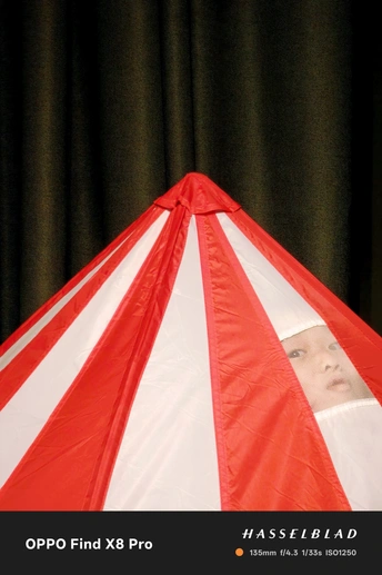 2025年10月4日 这张照片展现了一个有趣的视角和构图,红白条纹的帐篷占据了画面主要部分,色彩鲜明,引人注目。背景的深色窗帘与前景形成对比,突出了帐篷的形状。透过帐篷,隐约可见孩子的脸庞,增添了神秘感和趣味性。摄影师巧妙地利用了光影,使得帐篷的纹理和色彩更加丰富。整体而言,这张照片在色彩、构图和趣味性方面都表现出色,是一张富有创意的作品。可以尝试调整一下曝光,让暗部细节更清晰。