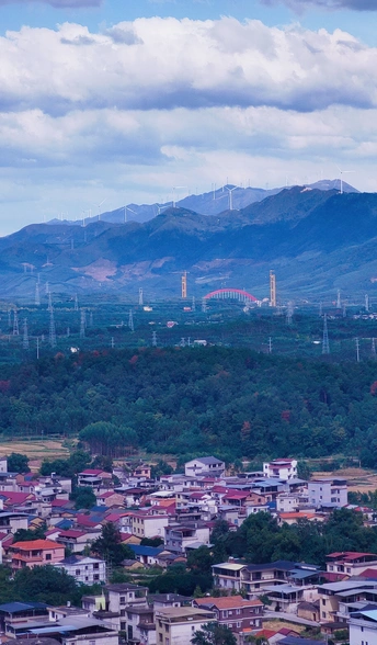 村外,深林,远山,风力发电,还有在建的漓江特大桥