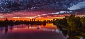 天刚破晓,朝霞已铺满天际,云朵被烫成绯色,河水漫着鎏金。小舟悠悠行在光里,划开的涟漪揉碎朝霞。