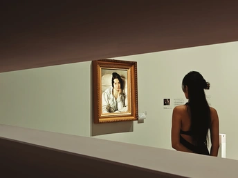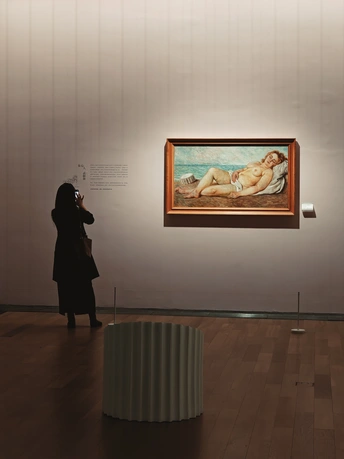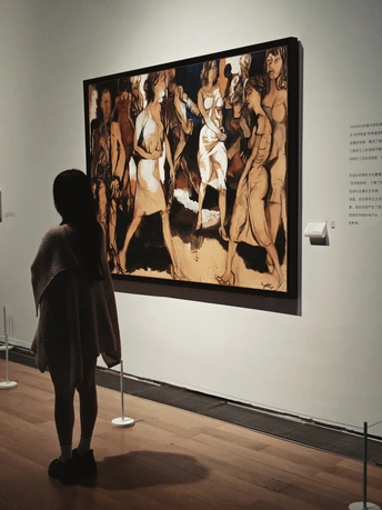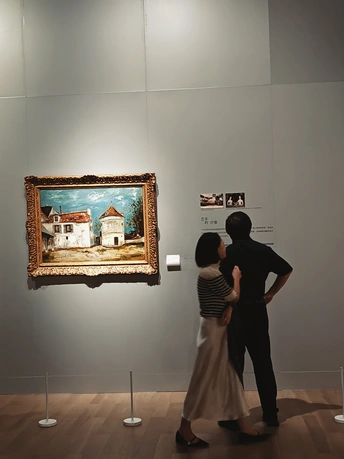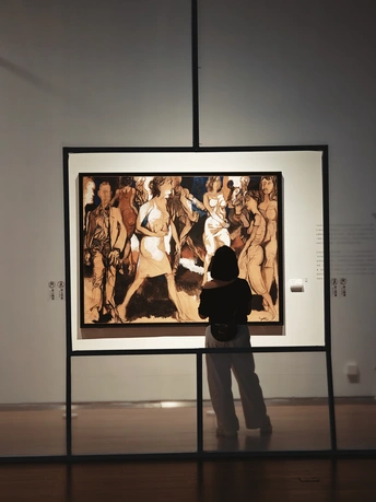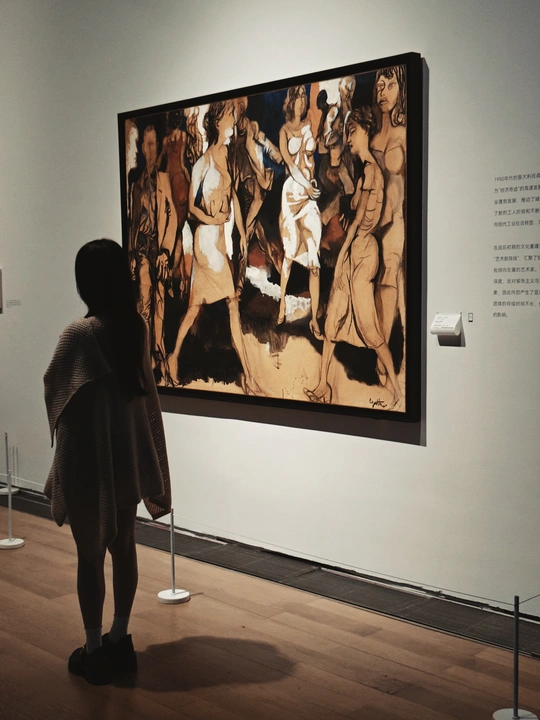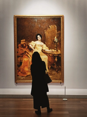 在艺术的殿堂里,时光悄然凝固。她驻足于古典肖像前,当现代的身姿与百年前的眼眸交汇,是两个时代的灵魂在展厅里无声对话,每一次凝视,都是一场跨越时空的艺术共鸣。