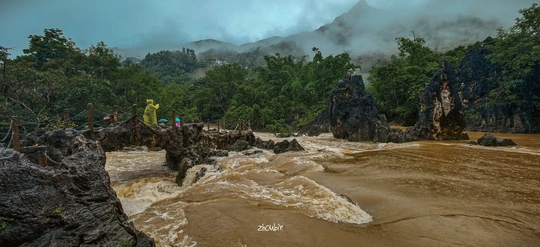 烟雨泼洒山峦,溪水裹着黄泥汹涌奔腾,石桥横亘湍流之上。每一滴雨落、每一朵浪涌,都在诉说山溪独有的狂野与静谧 。