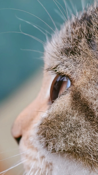 猫脸部的特写,清晰的胡须以及一只棕褐色的眼睛背景呈蓝调。特写展现了它们细腻的毛发质感和灵动的眼部特征。毛发的纹理(每一根细毛的走向、粗细变化)、眼部周围的绒毛质感,甚至皮肤的细微起伏清晰捕捉,把猫咪的“肌理世界”放大在眼前,有冲击力。