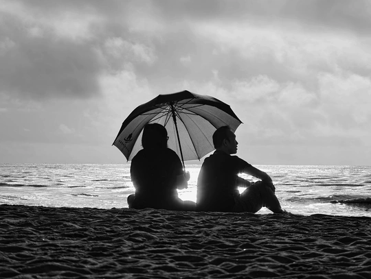 烈日沙滩,一对夫妻共伞遮阳,相伴无言,却道尽恩爱浪漫,人生值得。