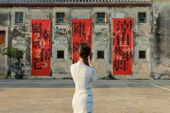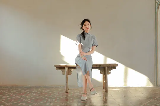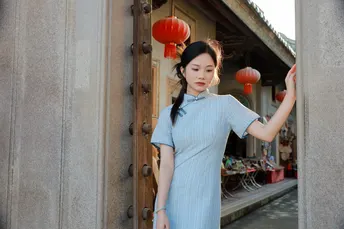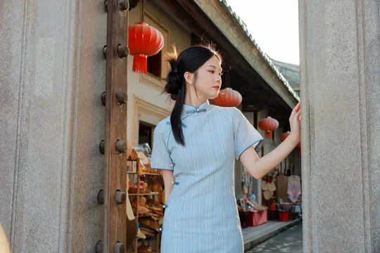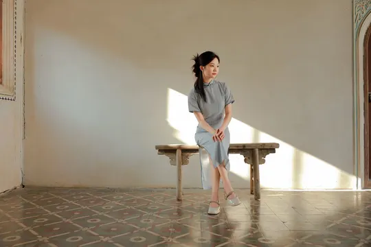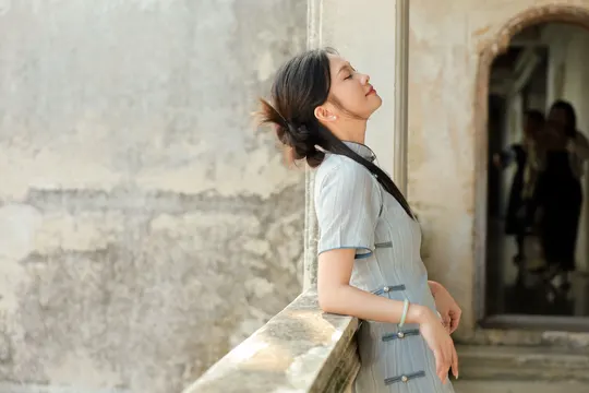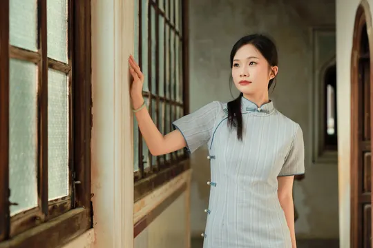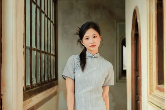 《巷影摇蓝》 出镜:小柯 地点:汕头市前美古村陈慈黉故居 浅蓝旗袍曳过斑驳墙影,玉镯轻叩木门雕花,窗光漏下"興隆"二字红晕。她倚栏回首的刹那,廊下风动瓷瓶梅枝,一地碎光成偈。
