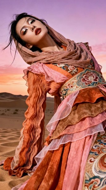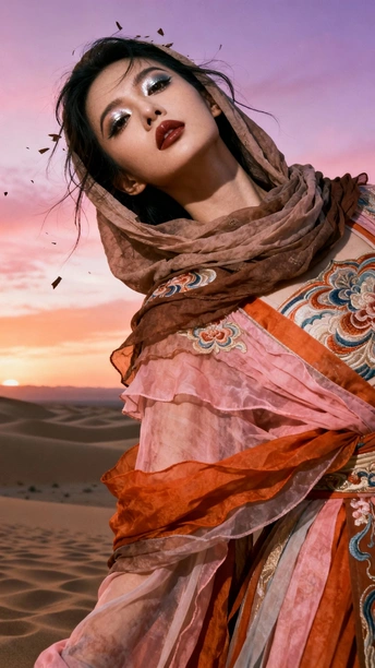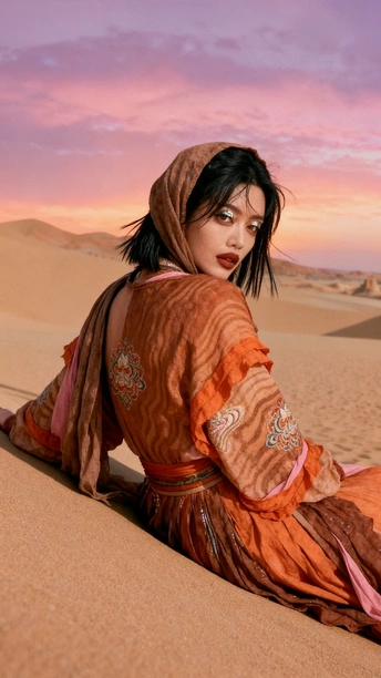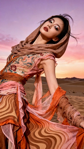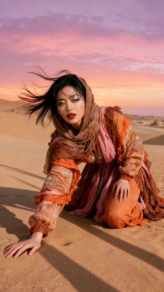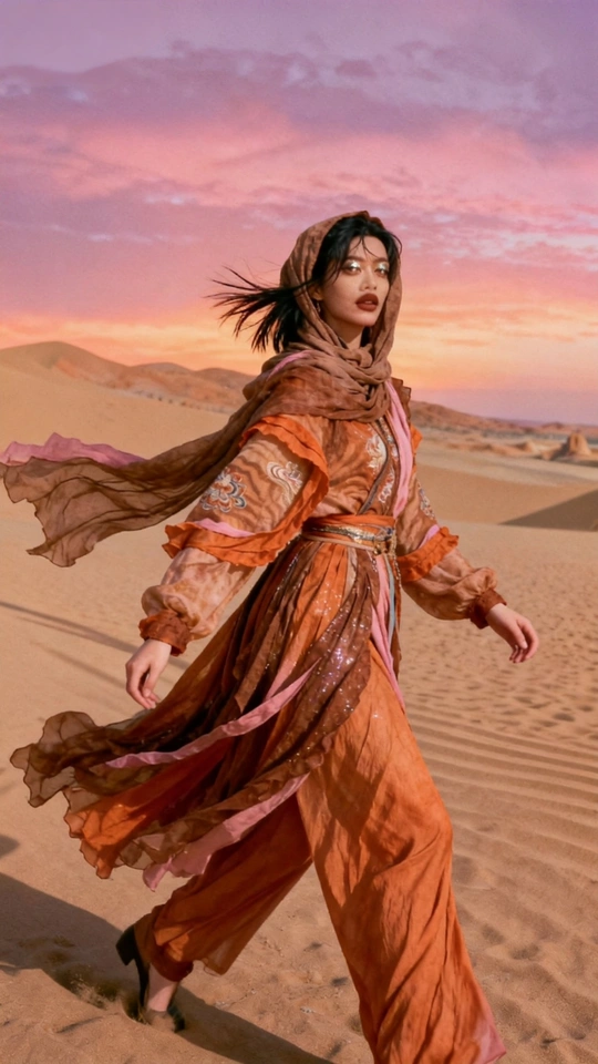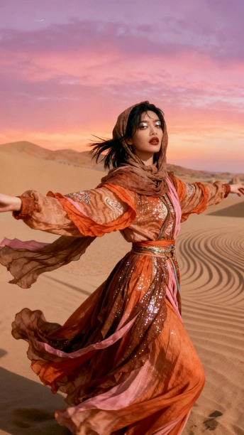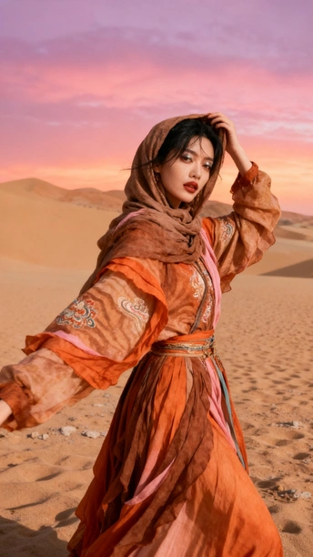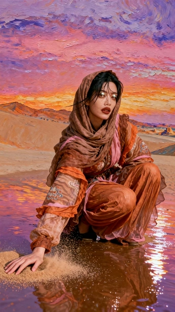 她是沙漠豢养的火焰 在沙粒的波浪里 织着风的绸缎 那些绣在衣摆的花 是丝路遗落的梦 在暮色里发芽 头巾裹住半片晚霞 眼尾的金粉 是沙丘的星光在眨 她俯身时 裙裾洇开的纹路 是沙海流动的年轮 藏着千年的话 风从远方来 带着驼铃的嘶哑 她在沙之境里 站成丝路的神话 每一缕飘动的纱 都是历史与此刻 共舞的时差