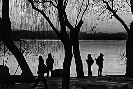 这张黑白照片捕捉了湖边人物的剪影,整体氛围宁静而略带忧郁。以下是一些更具体的评价: 色彩:黑白处理简洁有力,去除了色彩干扰,更突出了光影和形态。但如果能更好地控制灰度范围,使黑白对比更强烈,画面会更有冲击力。 光影:光线相对柔和,但轮廓勾勒清晰。前景树木的阴影增加了画面的层次感。可以尝试寻找更戏剧性的光线,例如日出或日落时分,以增强视觉效果。 构图:构图基本平衡,利用树木作为框架。人物的分布稍显平均,可以尝试打破对称,制造视觉焦点。三分法构图或许能带来更好的效果。 后期处理:黑白转换效果不错,但略显平淡。可以适当增加对比度,突出暗部细节,同时也要注意避免过度锐化。 主题原创性:主题较为常见,但在剪影的表达方式中融入了个人视角。可以尝试从更独特的角度切入,挖掘更深层次的故事。 情感共鸣:照片传递出一种孤独和沉思的情感,容易引起观者的共鸣。可以进一步强化这种情感,例如通过人物的姿态和环境的氛围。 思想深度:照片有一定的思考空间,引发人们对人与自然关系的思考。如果能更深入地挖掘主题,照片会更有力量。 总的来说,这是一张不错的黑白摄影作品,但仍有提升空间。继续探索光影、构图和后期处理的技巧