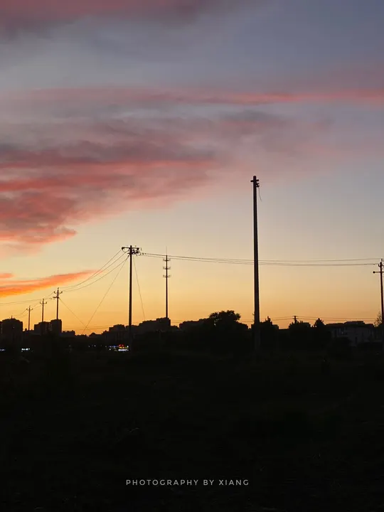 追一场城市边缘的日落 粉紫与暖橙撞进云里 电线杆的剪影牵着风 把寻常日子晕成温柔的诗