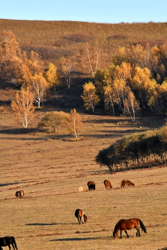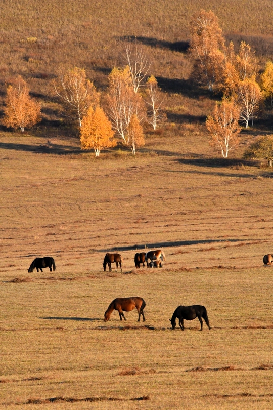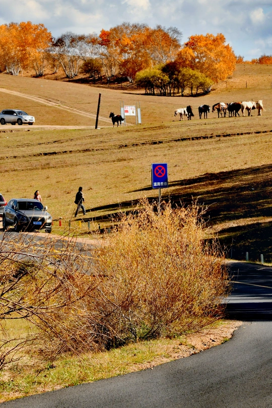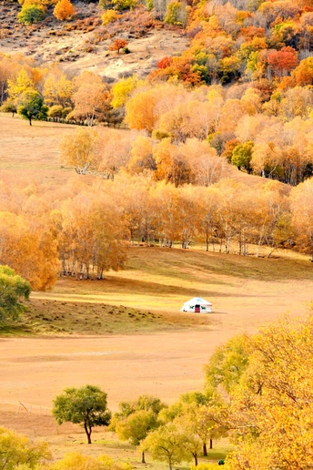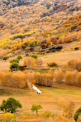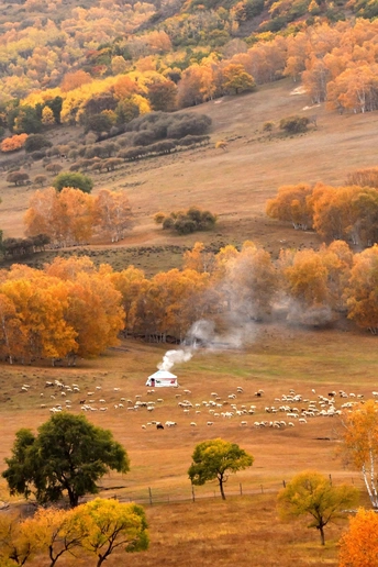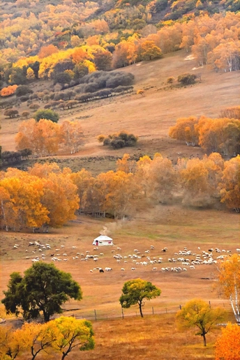 作品创作点滴:此作品如果无炊烟,无羊群,拍摄出来的照片便会无灵魂,无故事,无打动人的主要元素。随便拍出来只是美丽风景,彩林满山如油画一般。但是选择了临近黄昏之时,毯房内有炊烟起,牧羊人赶羊下山回家,如相中场景出现那一瞬间换下快门……一张让人浮想联翩的《秋日牧歌》作品诞生了。 《秋日牧歌》 斜阳树影长, 彩林遍牛羊, 毯房炊烟起, 欢声舞飞扬。 拍摄,诗词于 2025 9 28日黄昏。