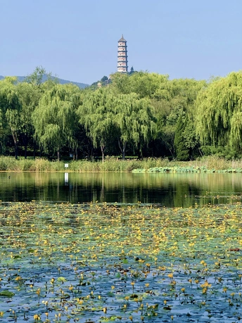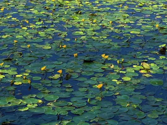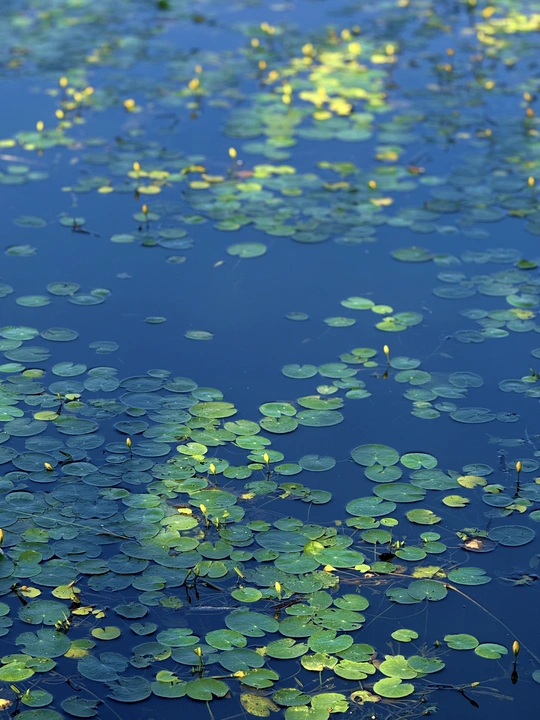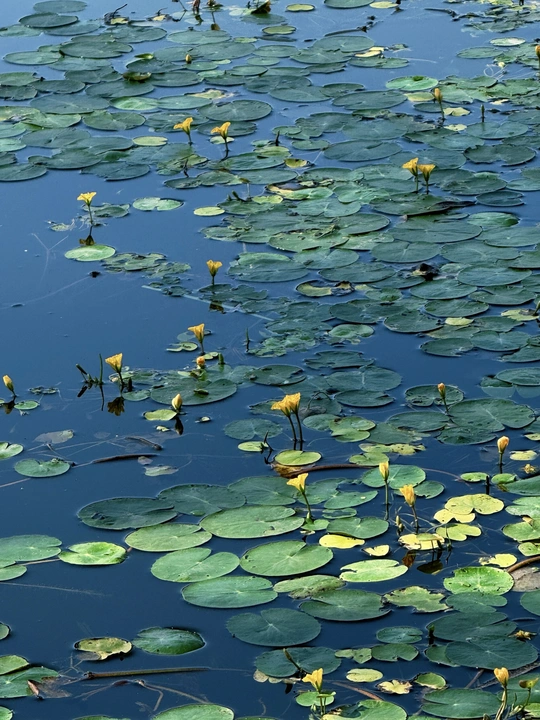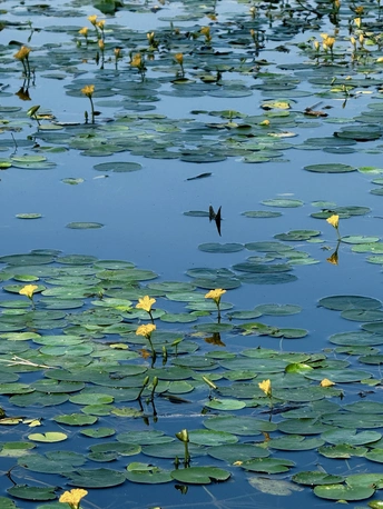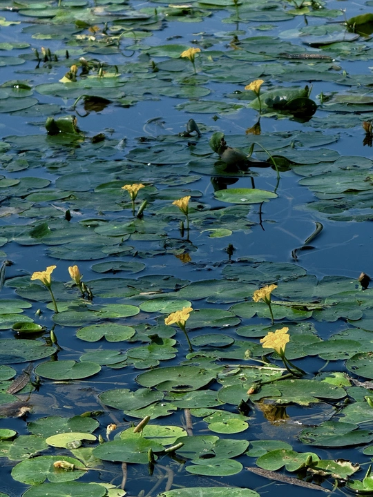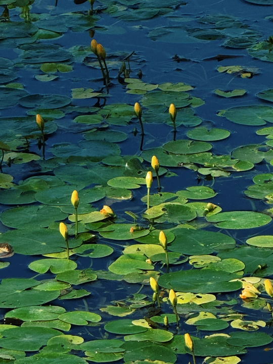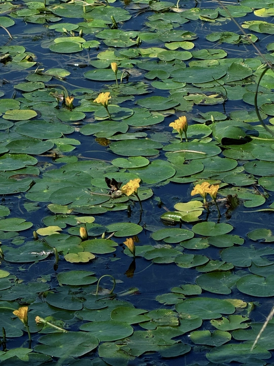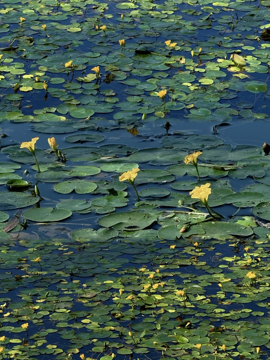 第一次见到《诗经》里的荇菜。 金黄的花盏开成了小喇叭,对着风絮絮叨叨。 荇菜的茎蔓在水里轻轻地晃,长的短的叶瓣像绸子, 左一荡、右一漾, 风掠过河面时, 就碎成了一滩晃悠悠的绿。
