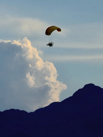 橙黄滑翔伞划破蓝天,扑向棉花糖般的巨型云朵,逐梦云霄间。