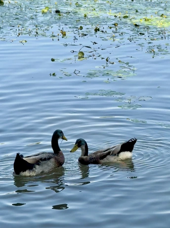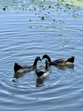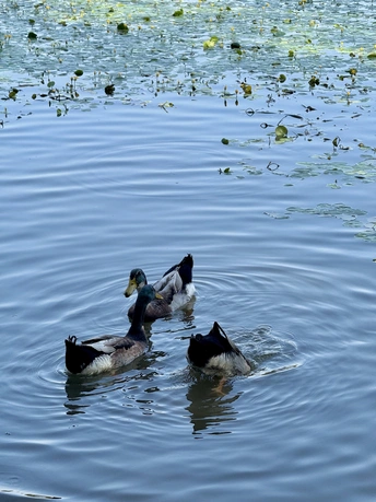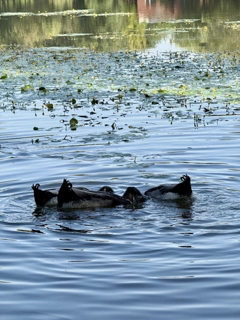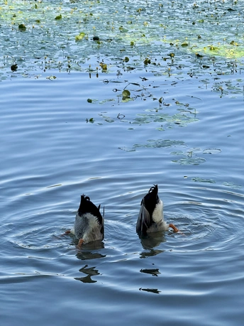 湖面是小鸭们的游乐场,把脑袋扎进水里,让尾巴翘成快乐的小旗帜,好像在跳水上芭蕾。