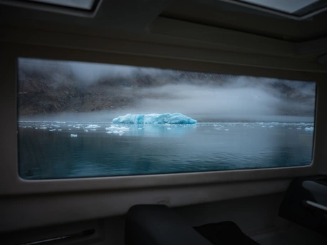 格陵兰岛南部峡湾,我们开船靠近峡湾深处的冰舌,海上浮冰渐渐越来越多。图为我透过小船窗户,拍摄的幽蓝浮冰,希望能让大家更有代入感。 拍摄:哈苏 X2D II 100C 参数:iso100 f5.6 1/90s 等效27mm