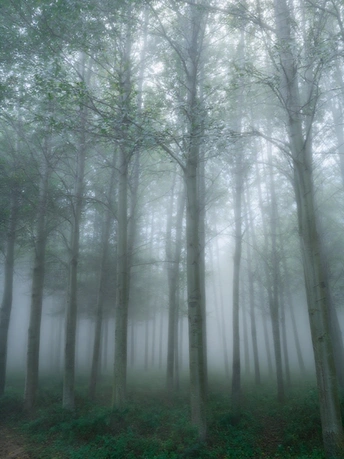 雾气如轻纱,将森林温柔笼罩。树木或挺拔伫立,或枝桠伸展,在朦胧间似是秘境的守护者,每一寸光影都藏着自然的诗意,仿佛踏入此间,便能与山林的静谧私语。