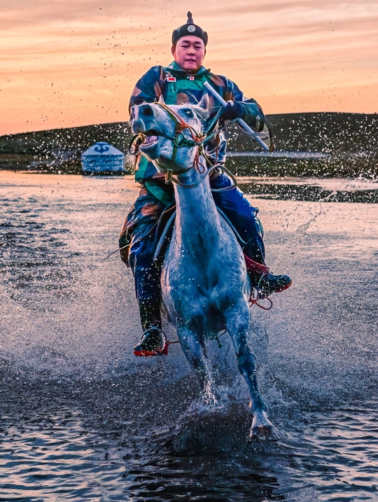 秋序渐浓,乌兰布统的黄昏被秋意晕染得格外温柔。可骑手与白马踏水而来的瞬间,却以极具张力的动感打破这份宁静,水花飞溅如秋露迸落,蒙古包在秋景中伫立成特色符号,那迎面而来的气势,恰似秋草在风中狂舞,将草原之秋的野性与摄影艺术的光影魅力,交融出震撼的秋日交响。