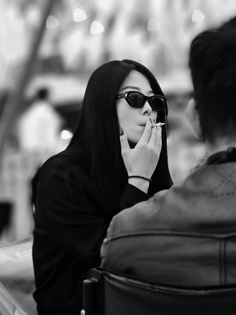 黑白滤镜下,她是都市丛林里的独行者。墨镜遮不住眼底的故事,烟圈晕开的是未说出口的情绪。在喧嚣的城市角落,这一刻的沉静与疏离,是属于她的自我对话,每一缕烟丝都在诉说着不被定义的人生。