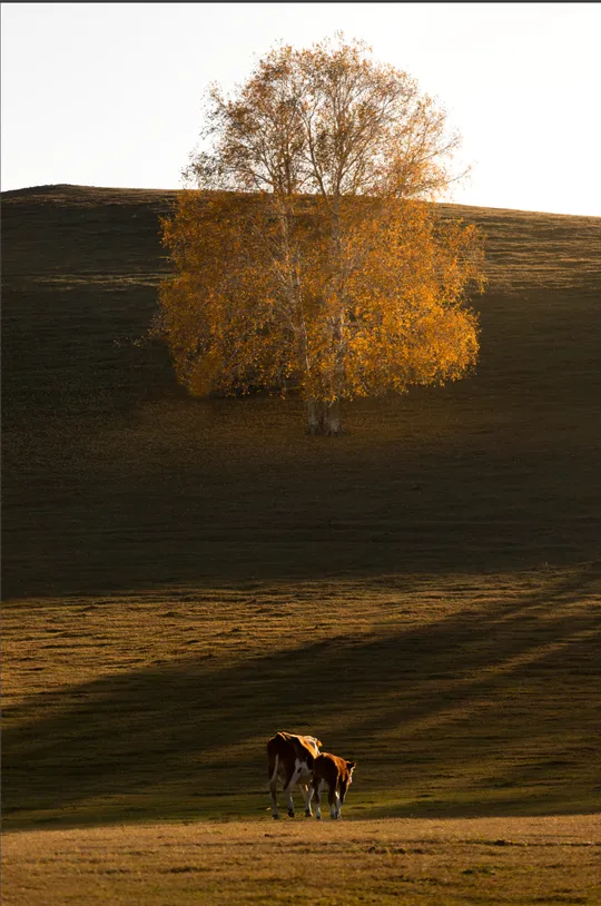 秋日的乌兰布统,是光影的盛大舞台,白桦树,牛羊成群,在夕阳或者朝霞的光影里让这个秋天更出彩