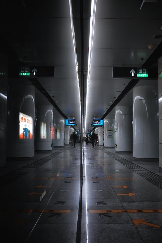 利用对称构图和光影对比,突出了地铁空间的结构美学,也反映出城市交通空间的规整与现代感。