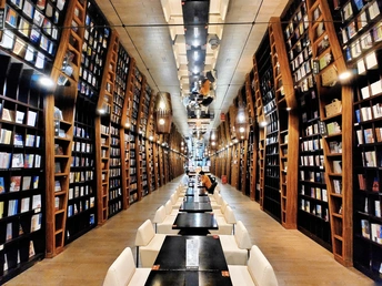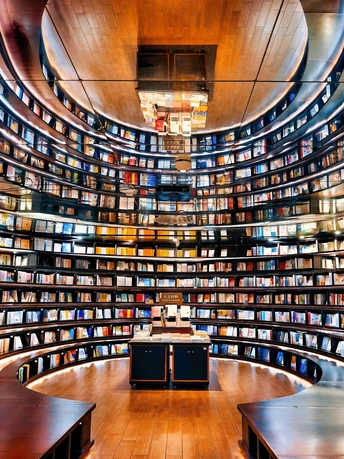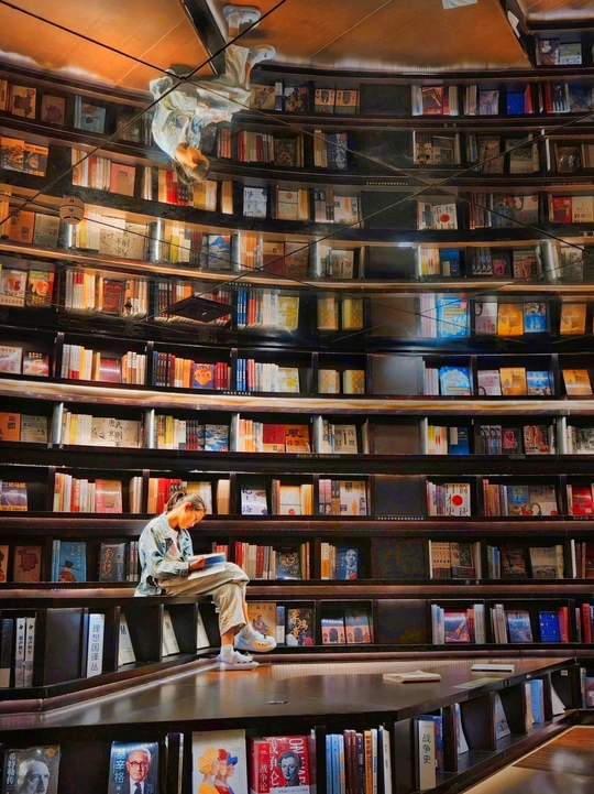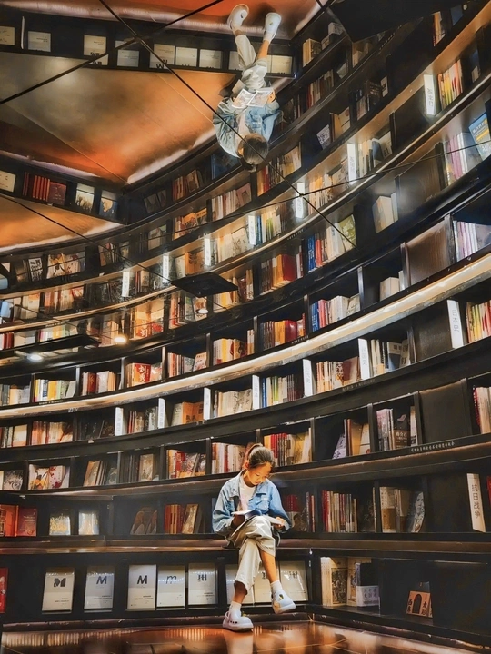在这独特的书店空间,穹顶与镜面交织出奇妙幻境,书籍如璀璨星河铺满墙面。女孩静坐其间,专注于书页,镜像让她仿佛与另一个求知的自己对话。每一本书都是通往不同世界的门,而她,正以阅读为舟,在这知识的穹宇里,驶向未知又迷人的精神彼岸。