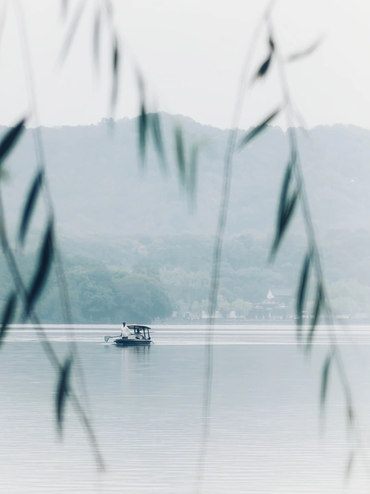 我轻提相机,将镜头对准这帧江南景致。柳帘轻垂,如天然的墨色丝绦,将西湖的湖光水色半掩半露。我屏息按下快门,捕捉到一叶扁舟悠然行于湖面的刹那,涟漪轻泛,似不愿惊扰这满湖的静谧。雾霭淡淡地晕染着远山与岸畔的亭阁,时光仿佛在此刻随我的拍摄动作一同放缓了脚步。舟上人影若隐若现,在柳影与水色的交织里,独享一份“舟自闲”的悠然,而我也在定格这画面的瞬间,任世间喧嚣远去,只余这柳帘、湖光、闲舟,与我手中的相机一起,珍藏下江南这缕淡雅清歌。