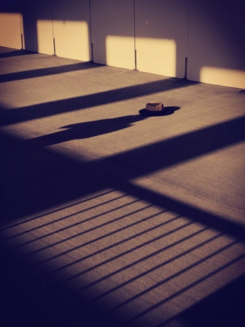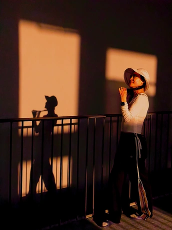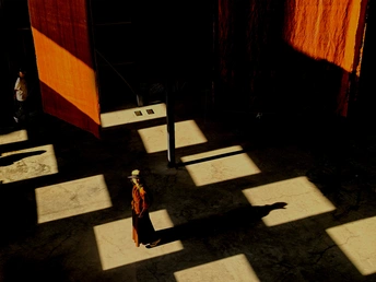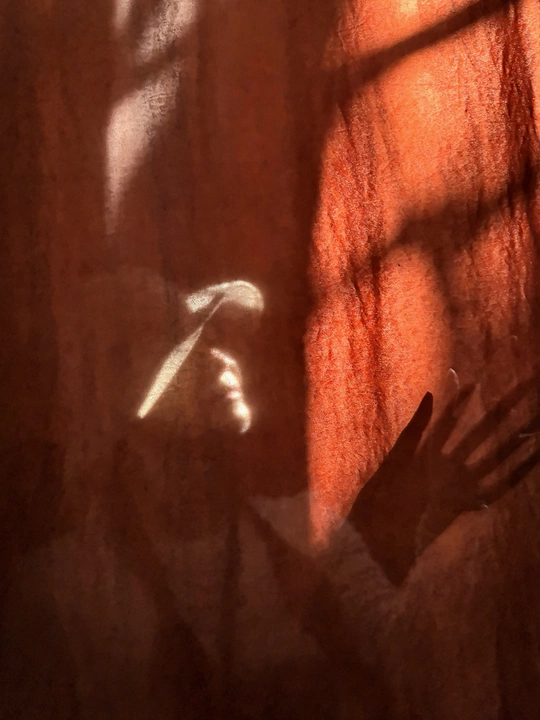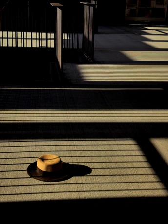 午后的阳光,透过玻璃窗,投射在地面、墙面、悬挂的香云纱上,形成漂亮的光影。 拍摄于佛山天意莨园。