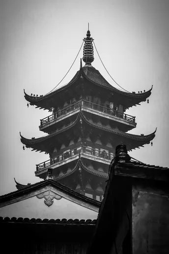 乌镇西栅的晨雾, 是水乡写给古塔的情诗。 我穿行在青石板老街, 一抬眼便撞见这帧画面: 白莲塔在雾中若隐若现, 飞檐如振翅欲飞的蝶, 塔铃似挂着水乡的软语。 前景的民居檐角, 是乌镇人烟火日常的注脚。 按下快门时,雾汽掠过脸颊, 仿佛听见千年塔影与水乡人家的絮语, 这一刻,西栅的晨雾、古塔的沧桑、民居的温软, 都凝在这黑白方寸里,成了江南旧梦中最绵长的一段回响。