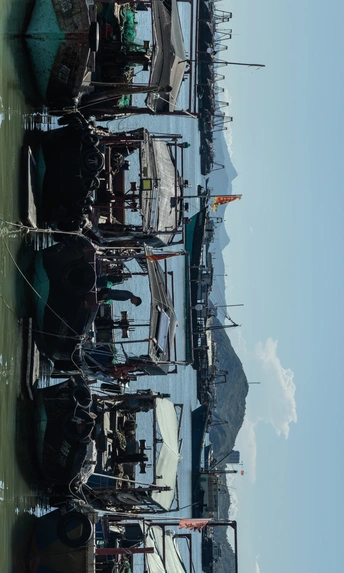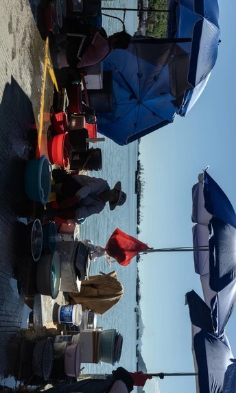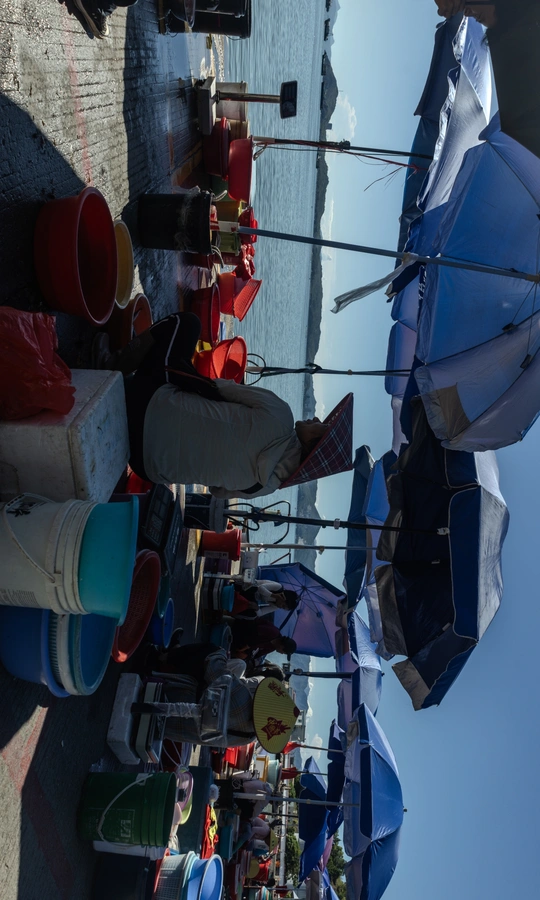 在我们老家那边有很多靠近海边的码头市场,这里卖的海鲜都是每天从海里刚打捞起来的,非常新鲜,附近城市的人大老远的都会开车过来买,每次开车过来呢,我妈妈就去买东西,我就去拍东西,一举两得哈哈。 这么大的阳光拍的时候非常刺眼,不得不说佳能R5的翻转屏挺好用的,这么亮的户外环境光还能看的清楚,让我在逆光方向构图的时候,非常方便。